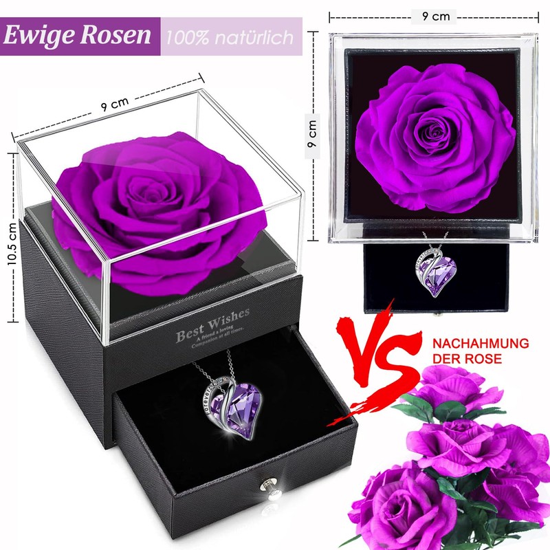 Ewige Rose Box mit Herz Halskette, Upgrade Geschenke für Frauen mit 4 Konservierte Ewige Echte Rosen & Herz Halskette aus 925 Sterlingsilber Schmuck Rosenbox für Geburtstag Valentinstag (Lila)
