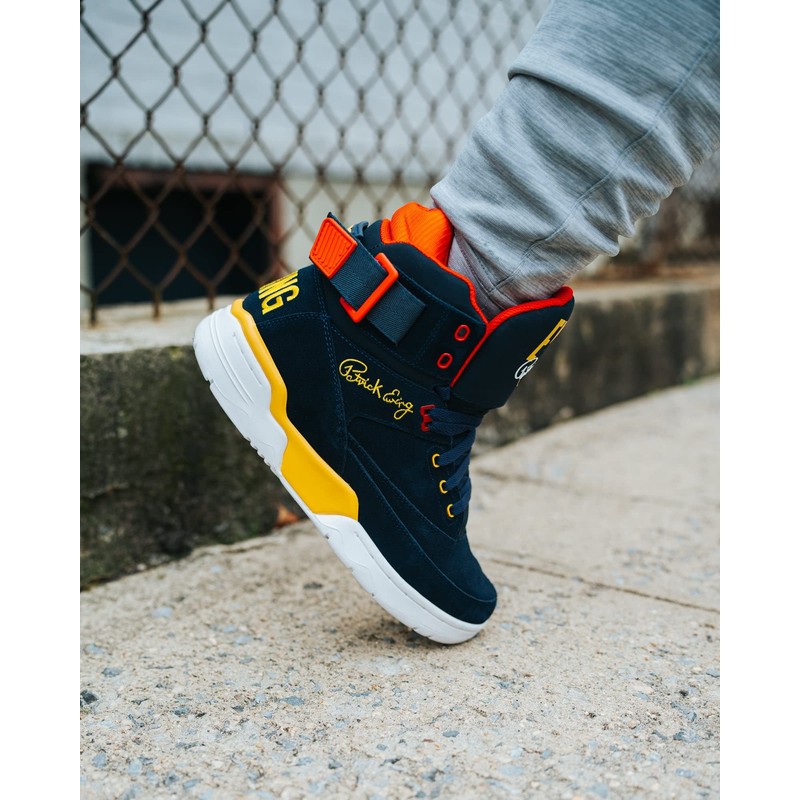 - The flagship Ewing Athletics shoe, the 33 HI is an exact retro of the 1990 original, and features a classic reversible ankle strap that can be worn on the front or back of the shoe, and a full length PU midsole for cushioning. This colorway features a premium Navy Suede upper along with Red, Yellow and White accents. Available in Mens Sizes 5-16.Product #1EW90128-433
