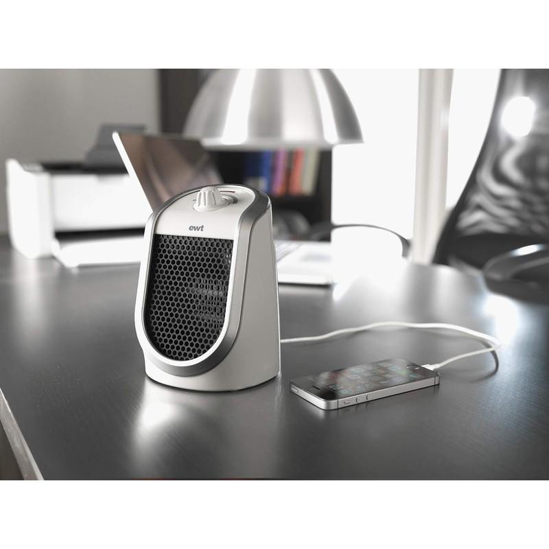 EWT Ceramic Fan Heater DDF 250 W, Compact Table Device with USB Port & Thermostat, Charging Function for Smartphone, Heater with LED Lighting, Infinitely Adjustable, 250 W, White