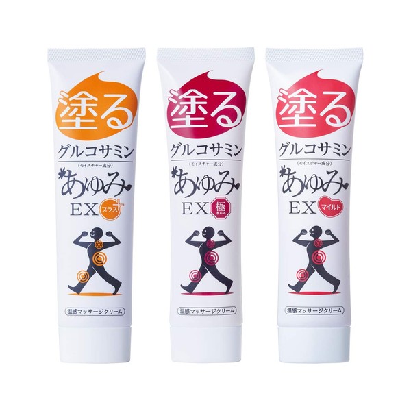 塗るグルコサミン あゆみEX 3種セット (プラス、極、マイルド) 温感マッサージクリーム 温かくて 気持ち良い ひざ 腰 肩 和らぐ ヒアルロン酸 コンドロイチン MSM配合ジェル
