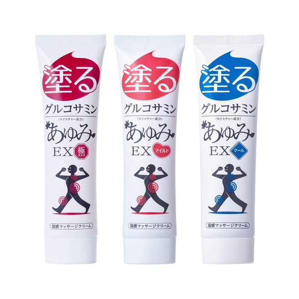 塗るグルコサミン あゆみEX 3種セット (極、マイルド、クール) 温感マッサージクリーム 温かくて 気持ち良い ひざ 腰 肩 和らぐ ヒアルロン酸 コンドロイチン MSM配合ジェル
