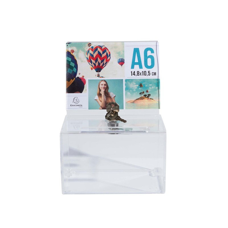 Exacompta - 89358D - 1 Urn with Lockable Lid for Banknotes, Elections, Idea Box, Donations, with A6 Display, Acrylic, Transparent, Size: 15 x 10.5 x 10 cm, Colour Crystal