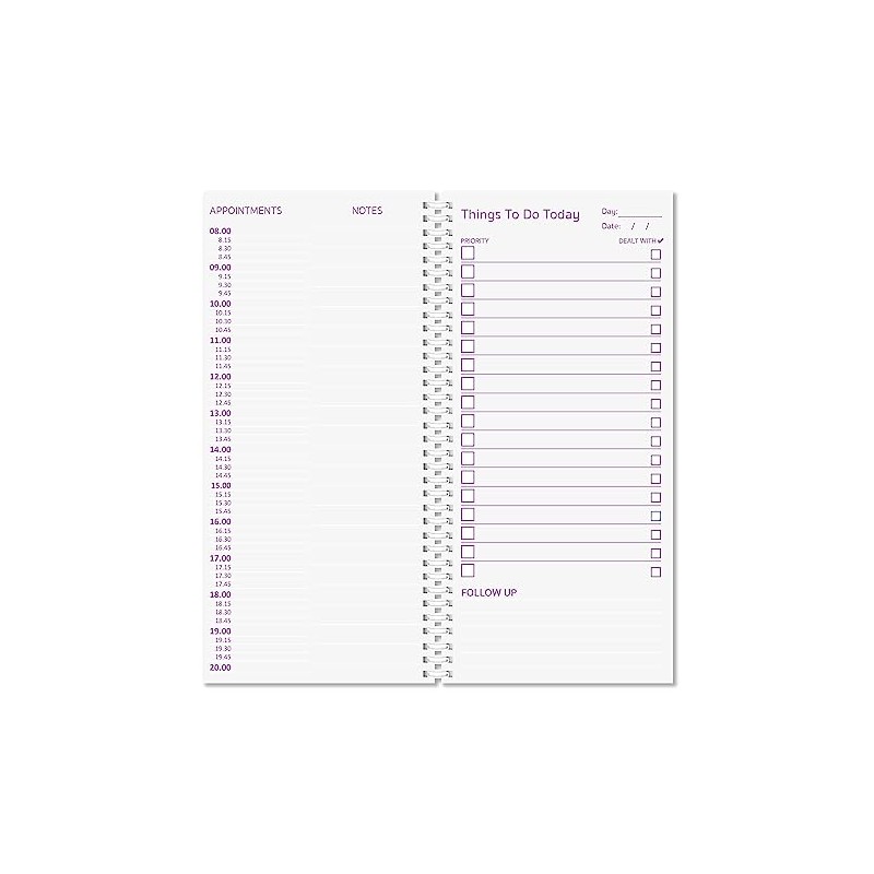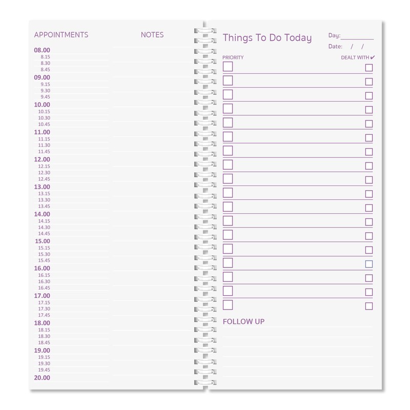 • Each sheet is printed with a section for the date and the day. A space for you to organise the prioirty of your tasks and a box for you to tick once your task has been dealt with. On the reverse of the page you can organise your day with appointments from 8am to 8pm.