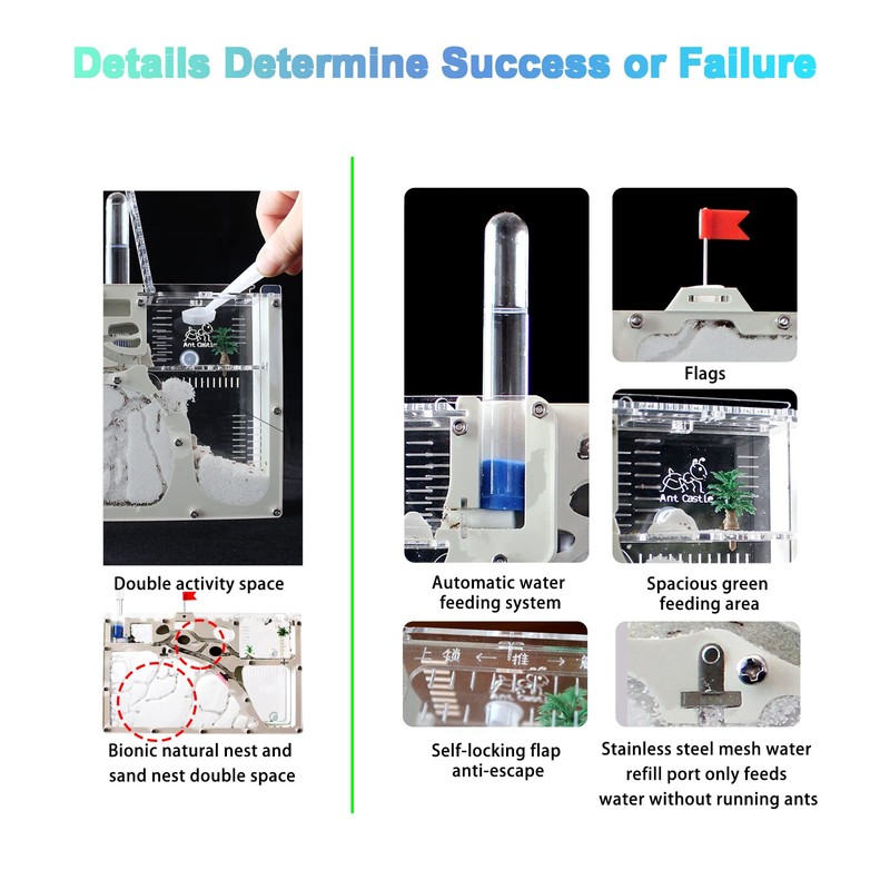 - 【Scientifically Designed Ant Farm】Our ant farm use a combination of bionic nest and excavated sand nest, wet and dry nest design, double wide foraging area, wide sand discharge pile area, no need to clean up frequently. The use of self-drinking water system, travel peace of mind and worry-free. Child lock, stainless steel mesh anti-escape design
