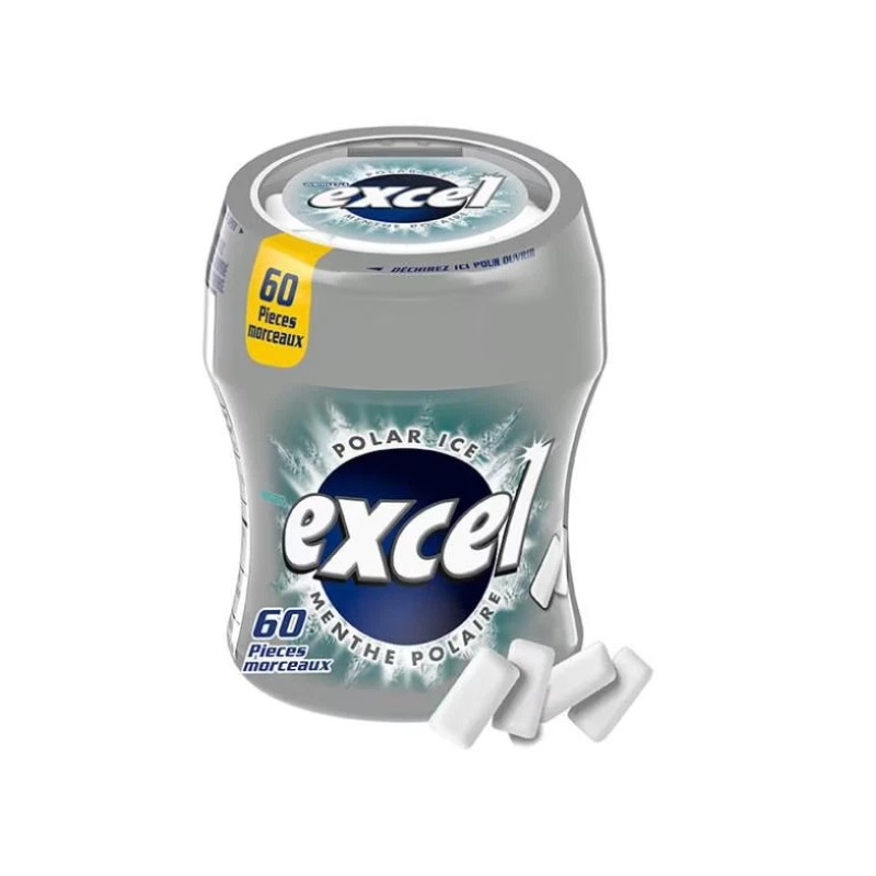 This product is a delicious Polar Ice flavored sugar-free chewing gum made by EXCEL. It comes in a bottle containing 60 pieces of gum with a total weight of 84g.