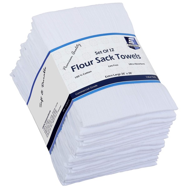 Flour Sack Kitchen Towels (White,12 Pack) 100% Cotton,28x28 Inch Cloth Napkin, Bread wrapper, Cheesecloth, Multi Purpose Kitchen Dish Towels,Bar Towels, Extremely Absorbent & Sturdy By Excellent Deals