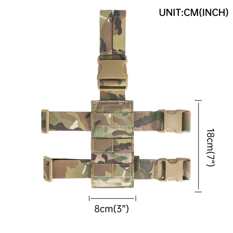 • Two nylon straps and elasticated thigh straps are fully adjustable, quick release buckles attach, three rows of molle webbing for pouches, holsters or other molle compatible gear. Main body size: 3 inches * 7 inches (L*W).