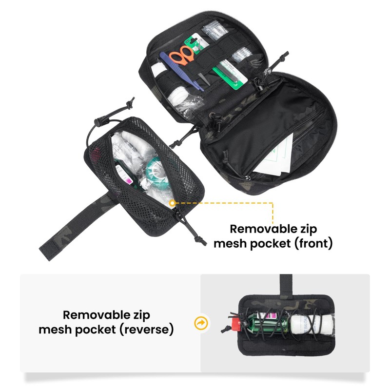 - Layout:Inside the main pouch there are many elasticated elastic bands and a zip pocket. Two elasticated straps at the bottom can be used to secure a tourniquet.Front zipped pocket for organisation and storage of all necessary items.Note: This product does not include internal tools
