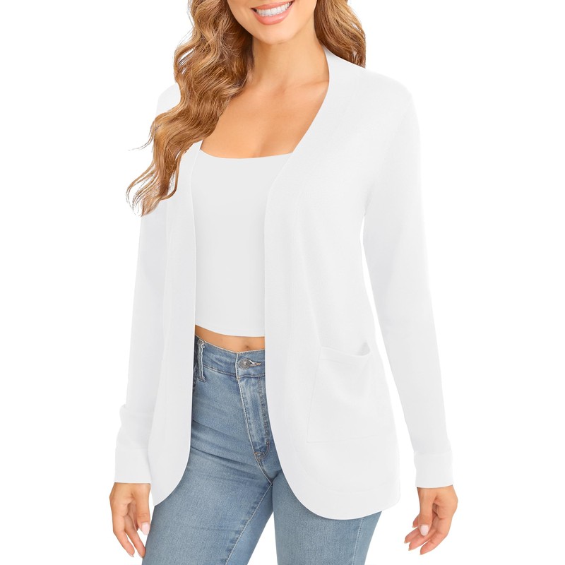 EXCHIC Women's Elegant Lightweight Long Sleeve Cardigan Curved Hem Open Front Knit Sweater with Pockets(White, M)