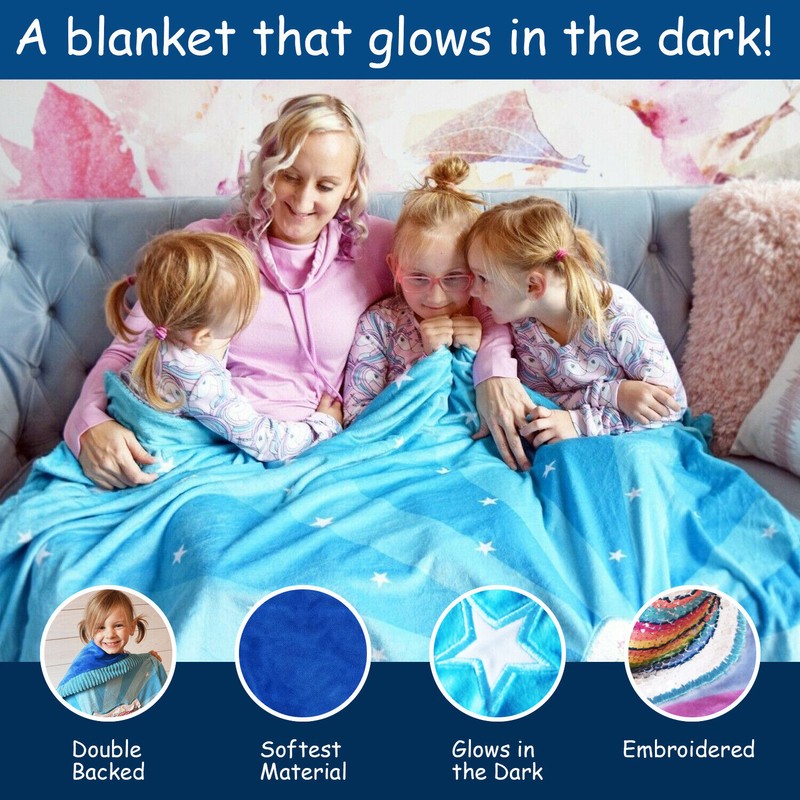 Safe Glow in the dark does need 30 minutes to “glow” and includes the 5 stars that will glow in the top corners. Also, blanket my have loose sequin from manufacturing process and will need to be washed initially when received.