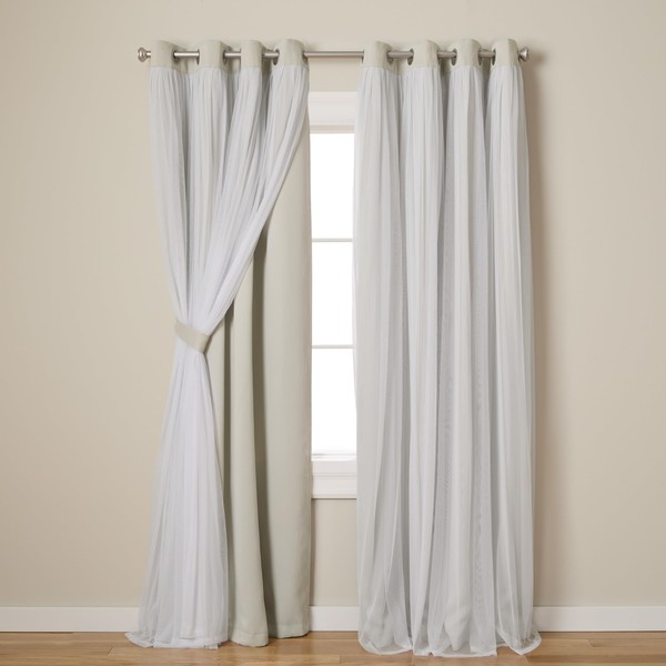The Catarina grommet top window curtain panels offer the function of a sateen woven blackout curtain paired with the fashion of a sewn in white sheer panel for layered sophistication. These panels offer depth and sophistication to your decor and will add a touch of luxury to your room. These woven panels drape beautifully and are interwoven with blackout insulation provided by LightBlock and Thermax technology. These panels will block light, prevent harmful UV rays from reaching your floors and furniture, efficiently prevents cold or heat transfer from outside, will increase energy efficiency of your home, provide unparalleled privacy, and allow you to create darkness at any time of day. Perfect drapery option for anyone seeking to block daylight, take a nap, or keep sun glare off your TV. The Carmela drapery is constructed with gorgeous, matte silver grommets and can be hung on your favorite curtain rod up to 1 5/8" diameter, adding yet another touch to the richness and luxury of your decor. These window curtain panels will drape beautifully from any window that could use that perfect, finishing touch. Our curtain panels are perfect for any living room, bedroom, family room, dining room, bathroom and office. Our stylish designs will suit any window space.