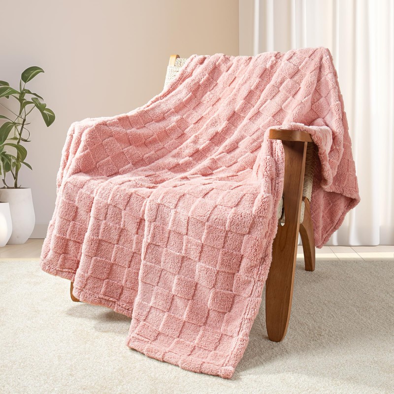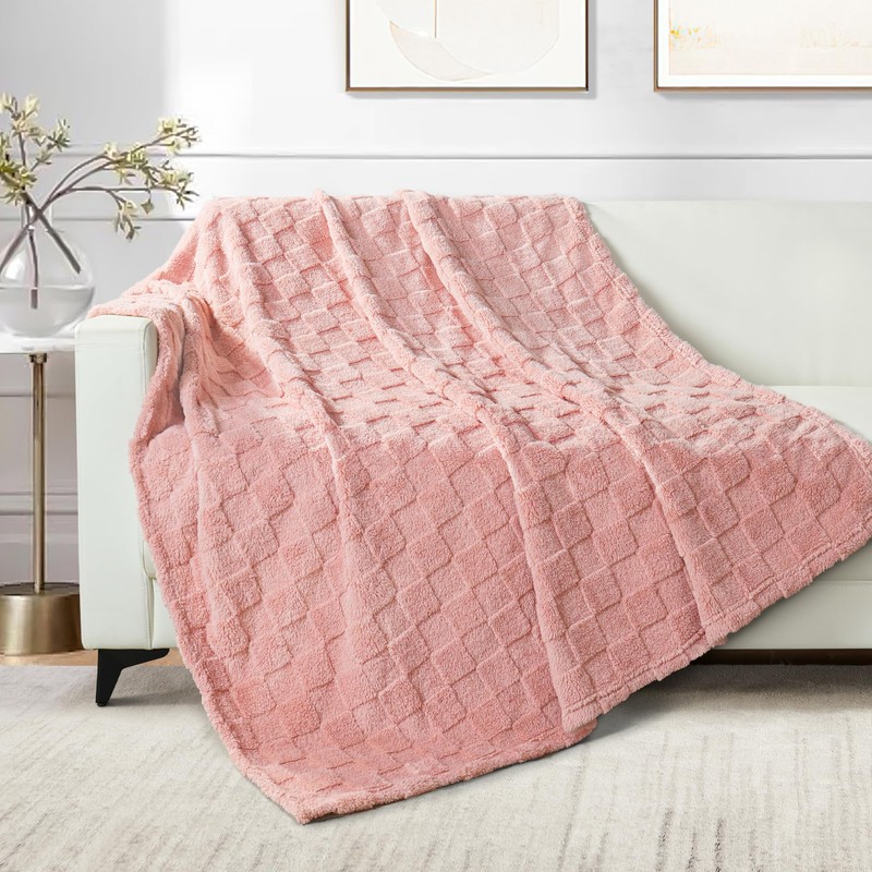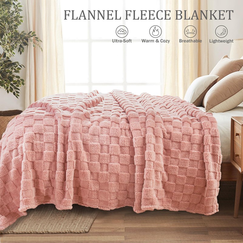 Exclusivo Mezcla Fleece Throw Blanket for Couch, Super Soft 3D Checkered Jacquard Bed Blanket, Cozy Fluffy Lightweight Blanket for All Seasons, 50x60 Inches, Pink Blanket