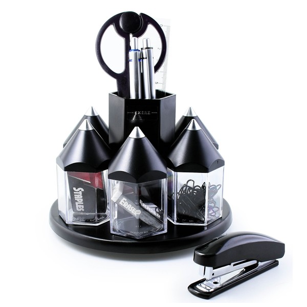 Exerz Black Desk Organiser, Rotating Pen Tidy with 5 Accessory Boxes, Stationery Kit Including: Scissors, Ruler, Eraser, Clips