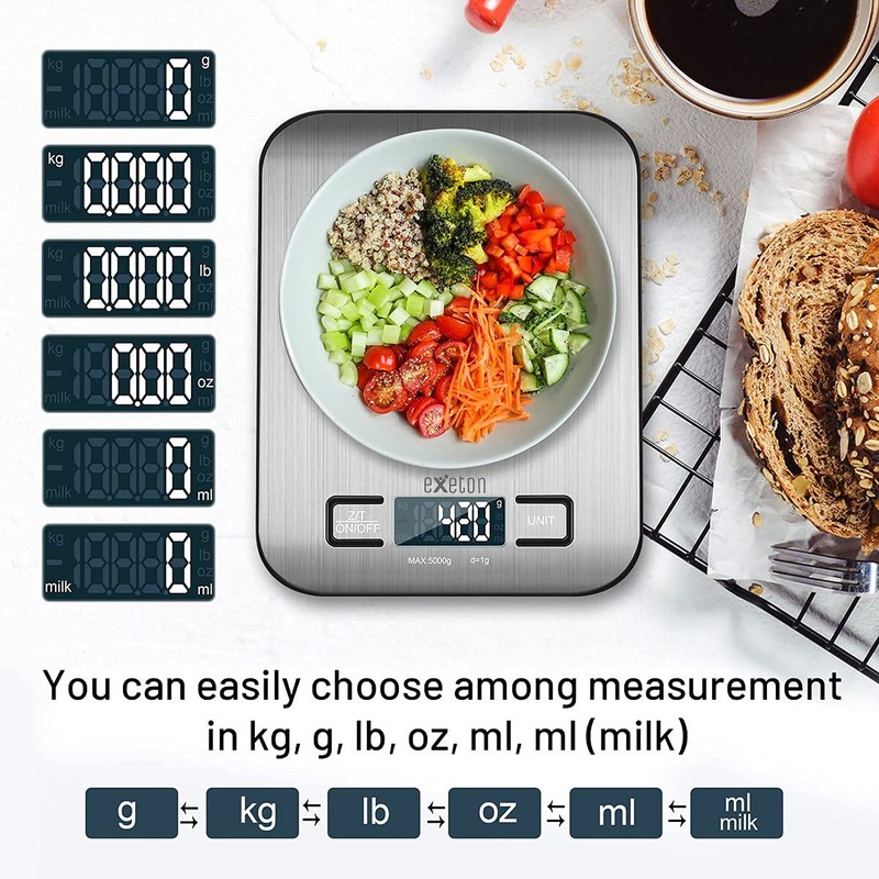 - 【ACCURATE MEASUREMENTS】 Exeton food scale with 4 new high precision sensors weighs up to 5kg (11 lb) graduation 1g/0.05oz,minimum weight recommendation 3g-5g.