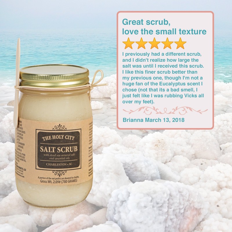 - PREMIUM SALT SCRUB BLEND: Made in the USA, Holy City Skin Products uses all-natural ingredients, sourced from fair trade suppliers. Perfect for gift-giving, the large 16 fl oz container of salt scrub is available in a variety of blends, each scented with natural essential oils.