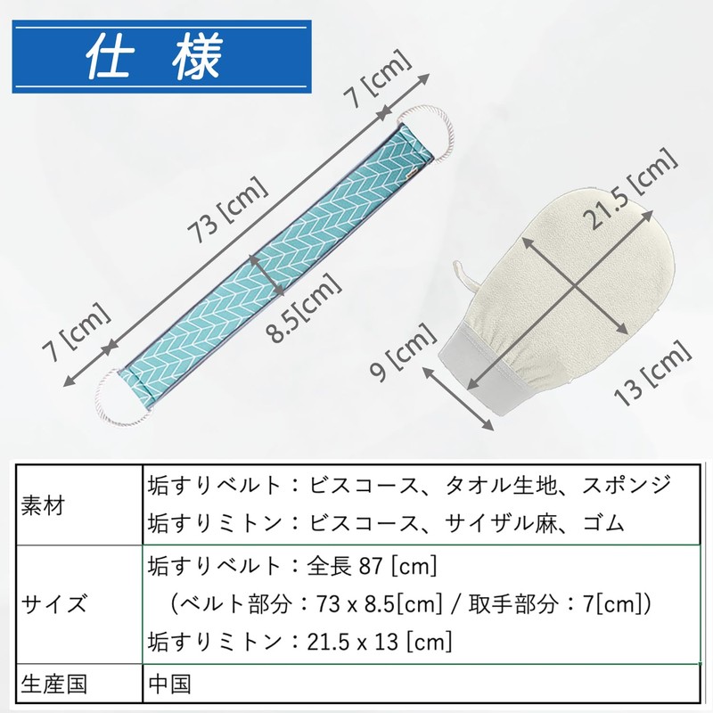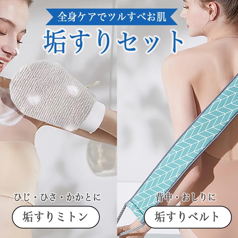 - (Full Body Care Set) The surface of the body is a grime mitten, and the hard to reach back is a grime belt. A value set that can be used to care for your whole body