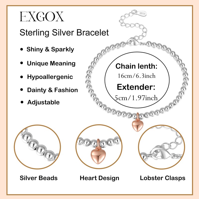 EXGOX Bracelets for Women 925 Sterling Silver Bracelet Adjustable Silver Bead Bracelet Love Heart Charm Ladies Bracelets Jewelry Gift for Women Girls (Small Heart Rose)