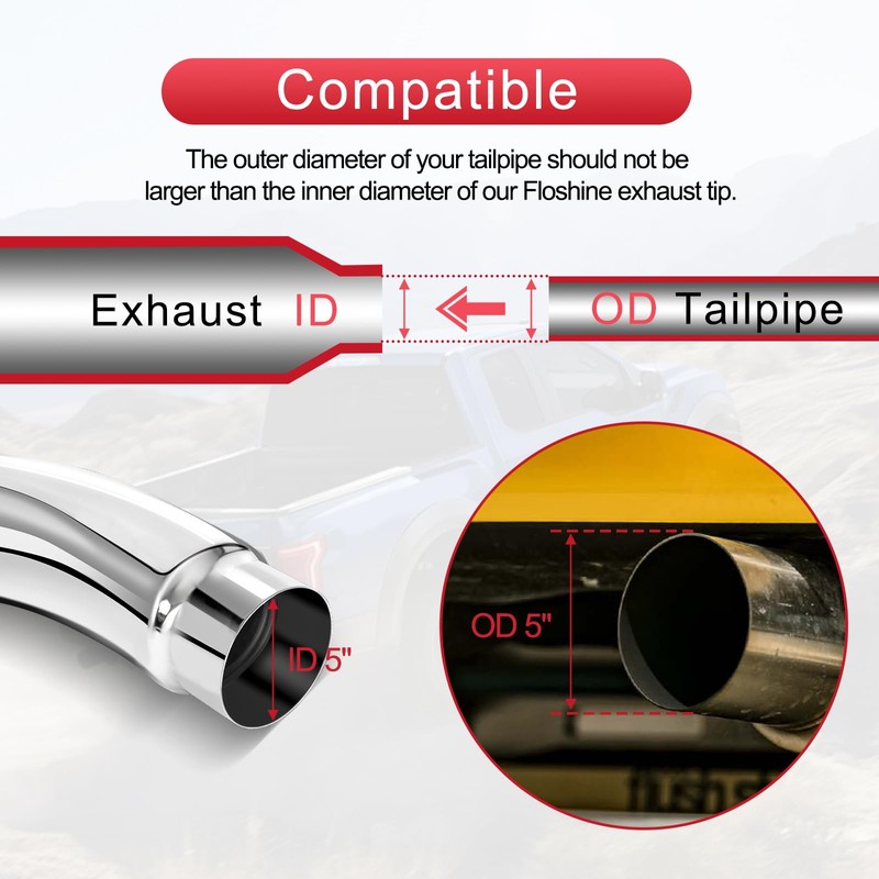 - Universal 5" OD Fitment: Compatible with all vehicles featuring a 5-inch Outer Diameter (OD) tailpipe, including pickups, trucks, and cars.