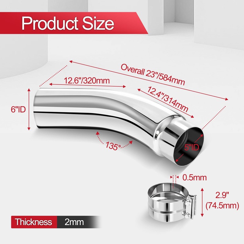 - Precision 135° Bend & Dimensions: Engineered with a 5-inch (102mm) Inlet ID and 6-inch (152mm) Outlet ID. Features an optimal 135-degree elbow angle designed for smooth exhaust flow and a perfect turndown fit. Total length: ~23 inches.
