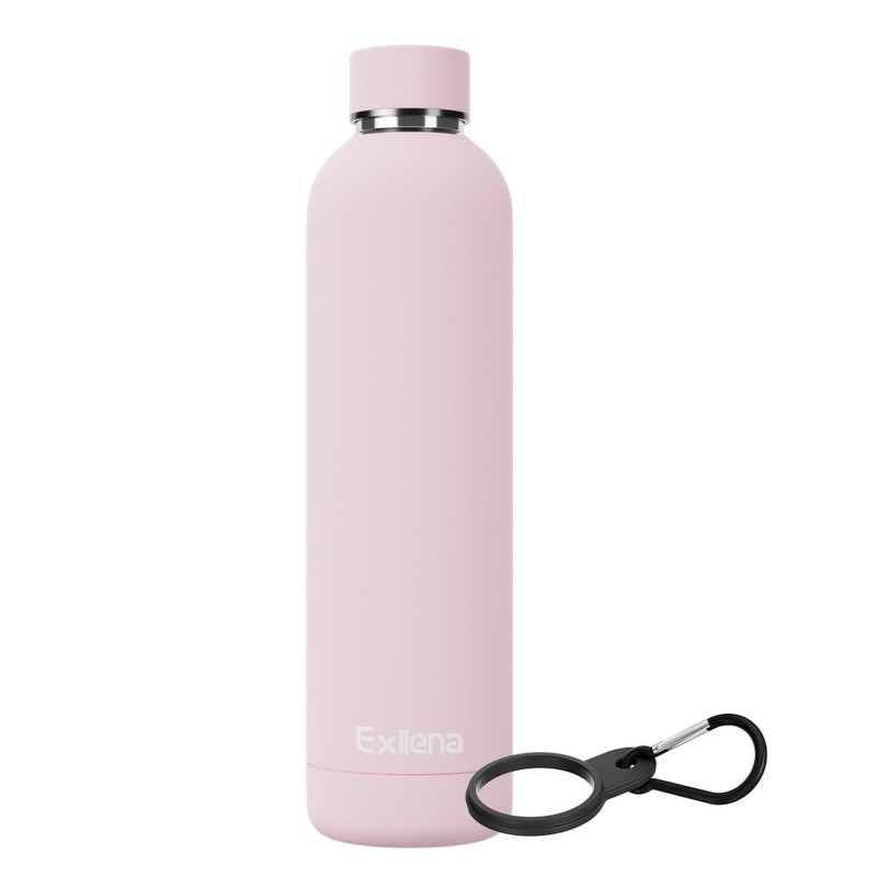 Exllena Insulated Water Bottles 1l with Clip, Double Wall Vacuum Drinks Bottle Keeps Drinks Cold 24 Hrs/Hot 12 Hrs, Stainless Steel Water Bottle BPA Free(Pink)