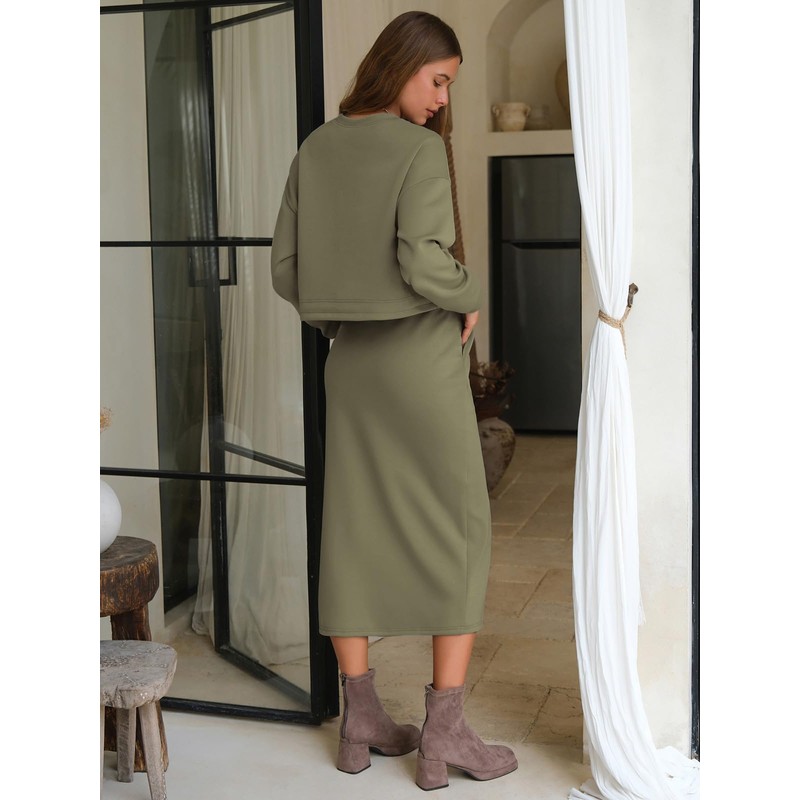 - Features:This Lounge Set includes a crewneck pullover top with long sleeves & adjustable drawstring hem, paired with a midi skirt featuring a stylish mid-length slit and practical side pockets. designed for all-day comfort with a trendy, flattering silhouette
