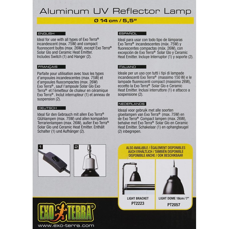 - Built with ceramic socket; for use with Exo Terra incandescent bulbs (max. 75 watts) and compact fluorescent bulbs (max. 26 watts)