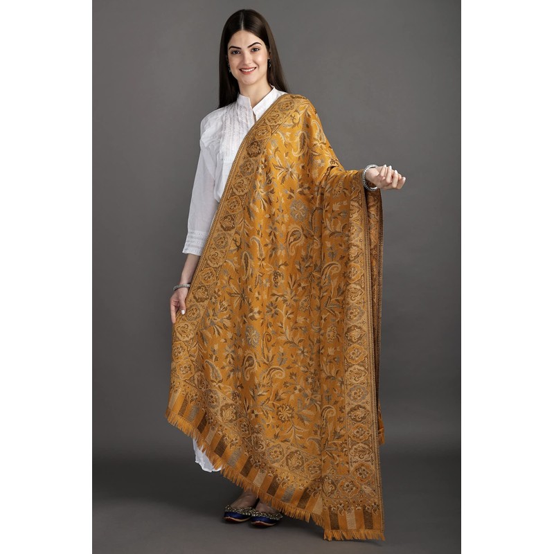Exotic India Reversible Jamawar Shawl from Amritsar with Woven Flowers - Wool - Color Butterscotch