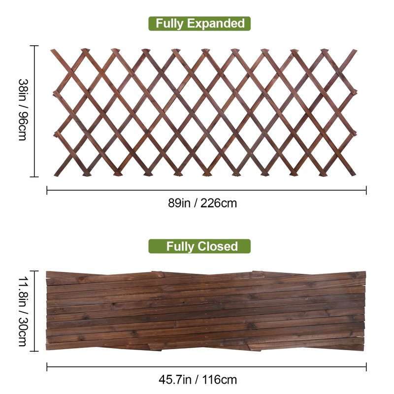- 🌲 【EXPANDABLE DESIGN】: The Closing dimension of the wood trellis is 46" in long and 12"in width. When the lattice panel is fully extended, the size is 38"in height, 89"in long. The trellis for climbing plant can be hung horizontally or vertically. Flexible frame design can meet your needs to fit for different space size.