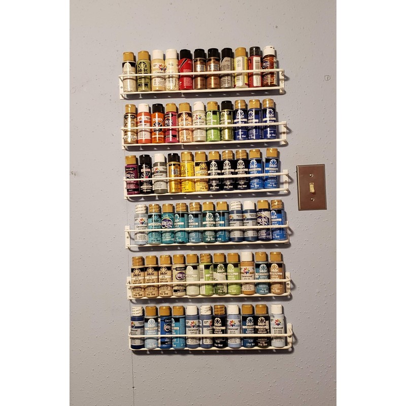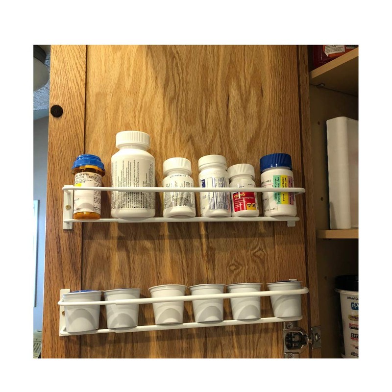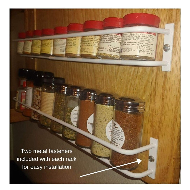 - DIMENSIONS: Expands from 10 3/4 to 18 3/4 inches; 2 inches deep and can hold up to 9 standard spice containers EASY INSTALLATION: 2 mounting screws included CONVENIENT STORAGE FOR: Spices, vitamins/medications, coffee pods, acrylic paints, pan lids & more GREAT FOR USE IN: Kitchen, pantry, bathroom, office, craft room, garage, RV/camper Saves space and keeps you organized