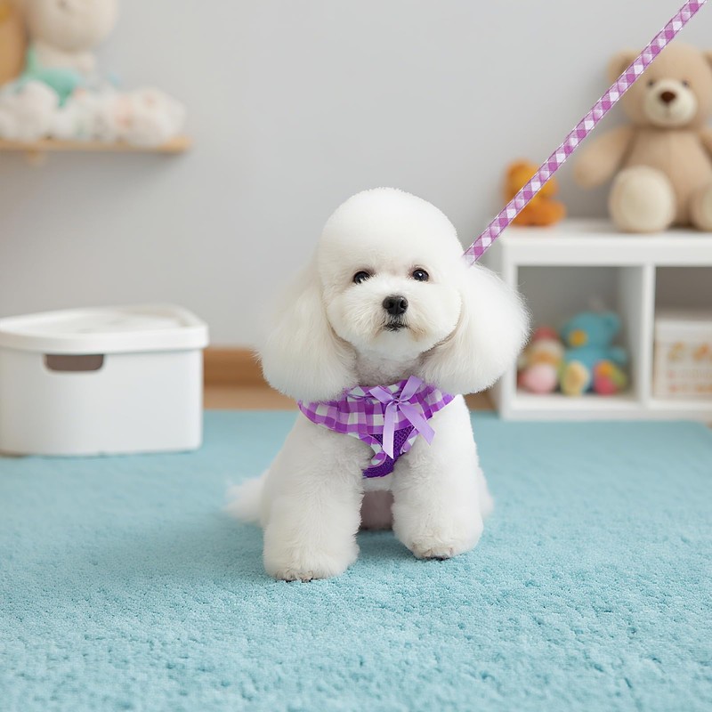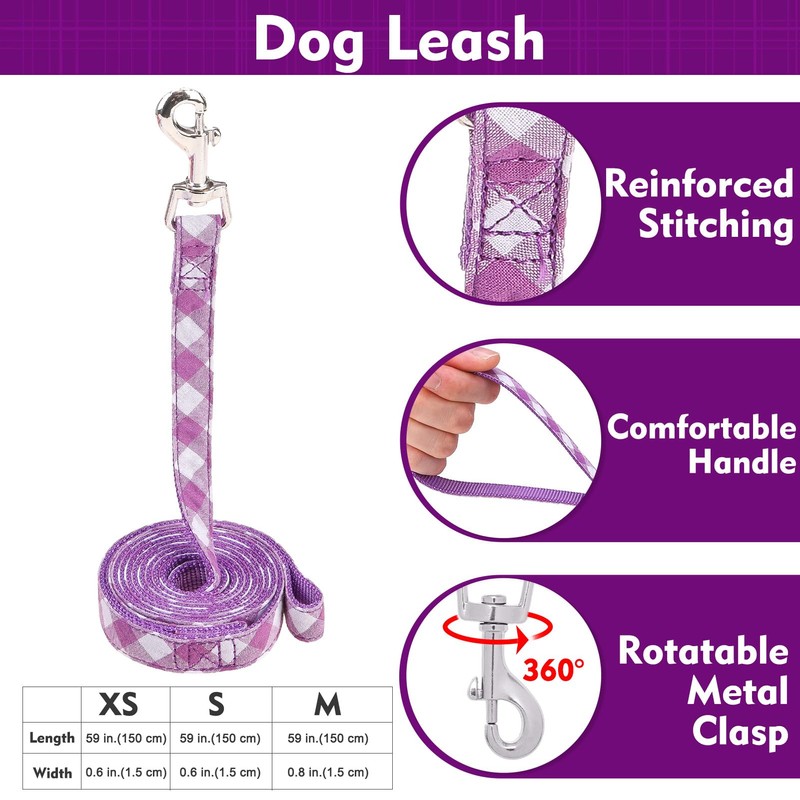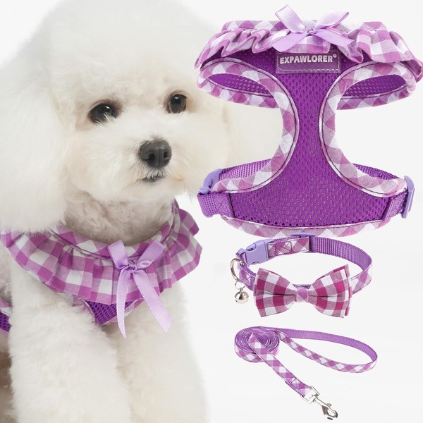 EXPAWLORER Cute Dog Harness Collar Leash Set - Purple Girl Dog Harness Checkered Step-in Design, Detachable Bow Pet Collar, Adjustable No-Choke Lightweight Mesh Vest for Cats Puppy Small Dogs, XS