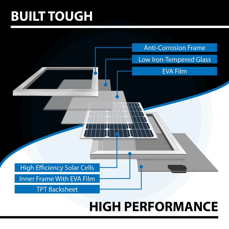 - Solid Quality: Panel is made with highly efficient monocrystalline solar cells protected by tempered glass and aluminum frame, which withstand high wind (2400Pa) and snow loads (5400Pa).