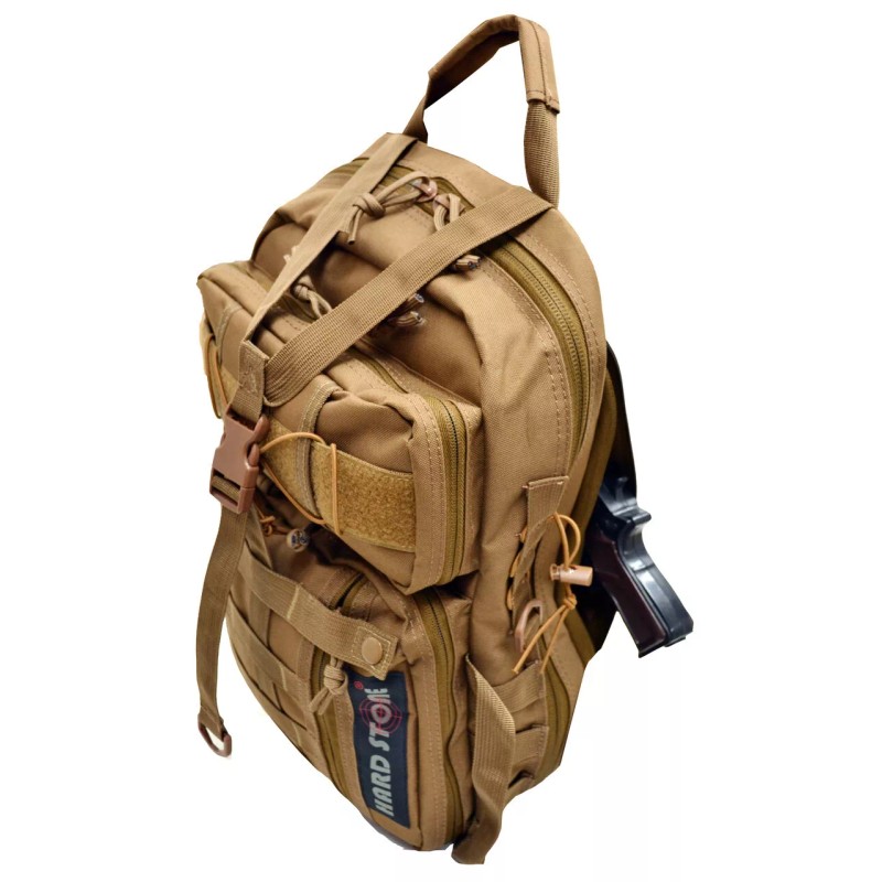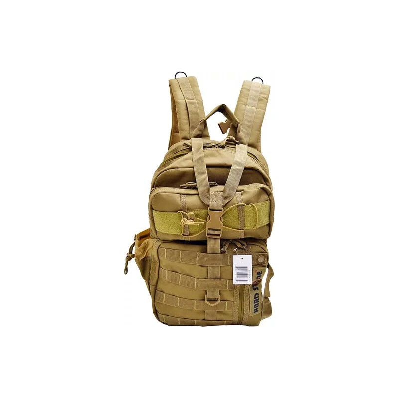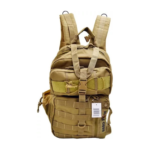BACKPACK TAN Capable of housing a 72 oz hydration bladder Plenty of pockets and compartments to keep everything organized Reinforced double-stitched nylon seaming for long-lasting durability.Heavy duty coil zippers Built to exacting standards from heavy-duty 600 D Polyester. Large middle compartment - Zippered interior small gear pouches. Polyester 100% Two Medium and small compartments for smaller gear Numerous MOLLE Loops and removable adjustable Padded Shoulder Straps and Waist Belt Huge expandable main compartment - with interior meshed enclosure for small gear. Side and Top cinched down gear security straps