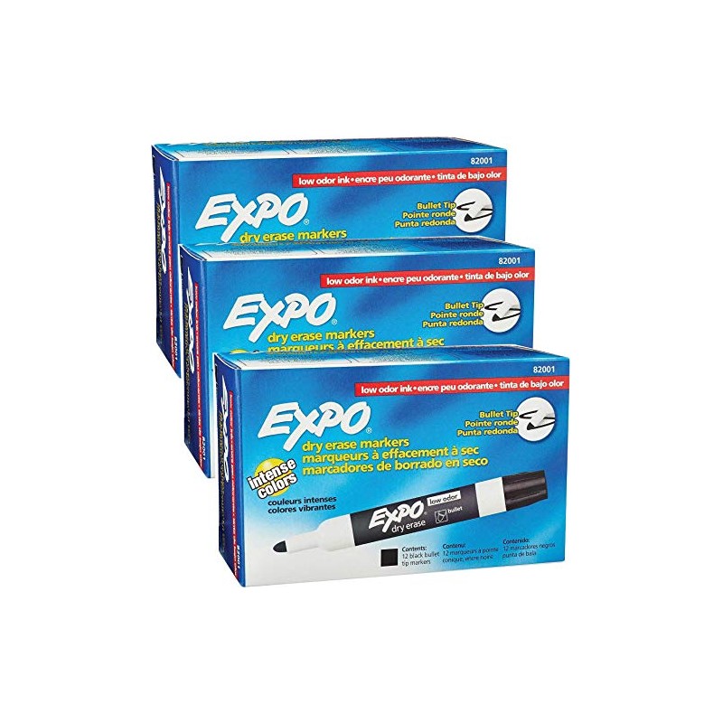 EXPO 82001 Low-Odor Bullet Black Dry Erase Markers For Use On Whiteboards, Glass and Non-porous Surfaces; Ideal for Classrooms, Offices and Homes, 3 Packs of 12 Markers (36 Markers Total)