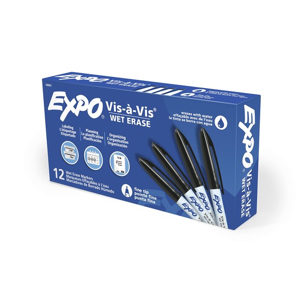 EXPO Vis-a-Vis Wet Erase Markers, Fine Point, Black, 12 Count