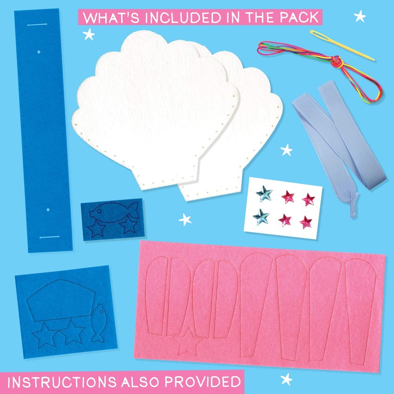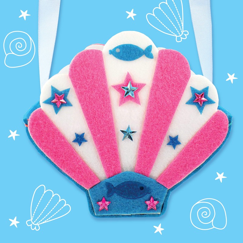 • Details: Create the perfect mermaid fashion accessory with this Create Your Own Shell Bag kit. This pack includes quality felt shapes, rainbow thread, child-friendly needles, ribbon and bright glitzy gems that let them finish their masterpiece with a touch of WOW! Please note this set is not suitable for children under 6 years old.