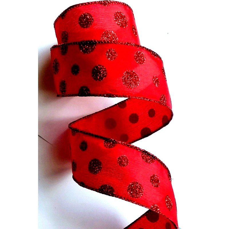 Expressions Christmas 1.5" by 2 yd Wired Ribbon Bright Red Glittered Polka Dots On Red