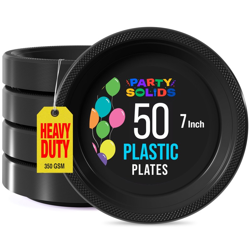 Exquisite Party Solids Black Plastic Plates For Party Supplies 7" Black Disposable Plates Heavy Duty 50 Pcs Plastic Dinnerware Sets Heavy Duty 350 GSM Disposable Dinnerware Set