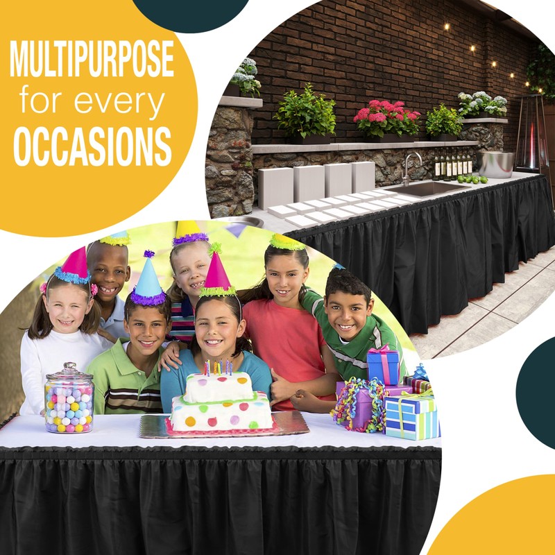 - Enhance your event decor with this exquisite 12 pack of Black 14-foot long elegant ruffled plastic table skirts. Designed to beautifully cover most tables up to 14 feet long, these table skirts hang down 29 inches, ensuring minimal transparency. Whether it's a wedding, corporate event, or elegant affair, these colorful table skirts add a touch of sophistication and style.