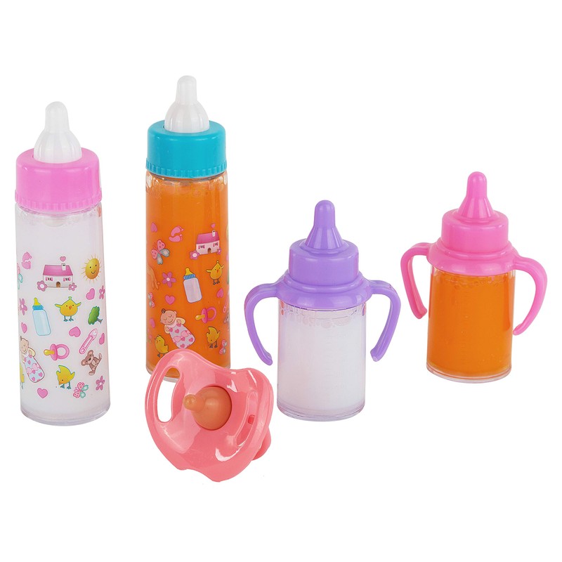 - MULTIPLE BABY DOLL ACCESSORIES: Sporting colourful design, our baby doll care set has doll accessories that are lightweight, washable and have a steady grip. The fluid level in each baby bottle decreases gently as its tilted. The toddler feeding play set includes baby doll accessories like a pacifier including two milk and juice bottles