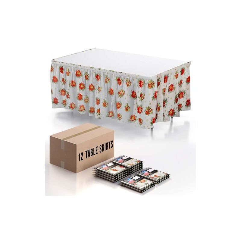 - Enhance your event decor with this exquisite 12 pack of Holiday 14-foot long elegant ruffled plastic table skirts. Designed to beautifully cover most tables up to 14 feet long, these table skirts hang down 29 inches, ensuring minimal transparency. Whether it's a wedding, corporate event, or elegant affair, these colorful table skirts add a touch of sophistication and style.