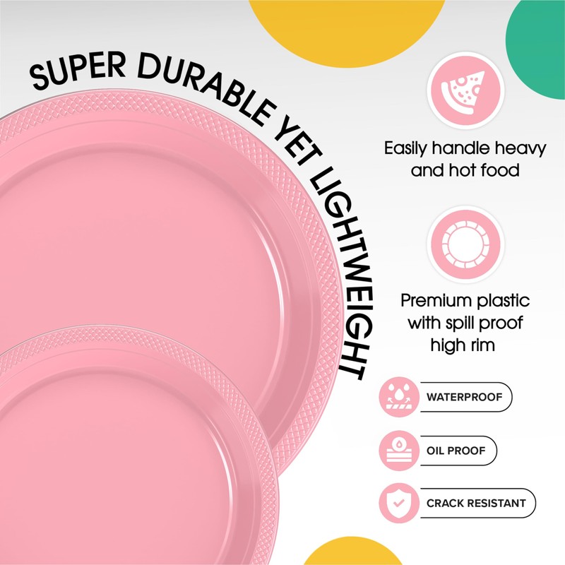- Includes: Each pack comes with 50 Pink 9 inch dinner plates & 50 Pink 7 inch dessert plates These plates may be used as dinner plates or cake plate and also make a great use as picnic supplies. Having these will complete your plastic dinnerware collection.