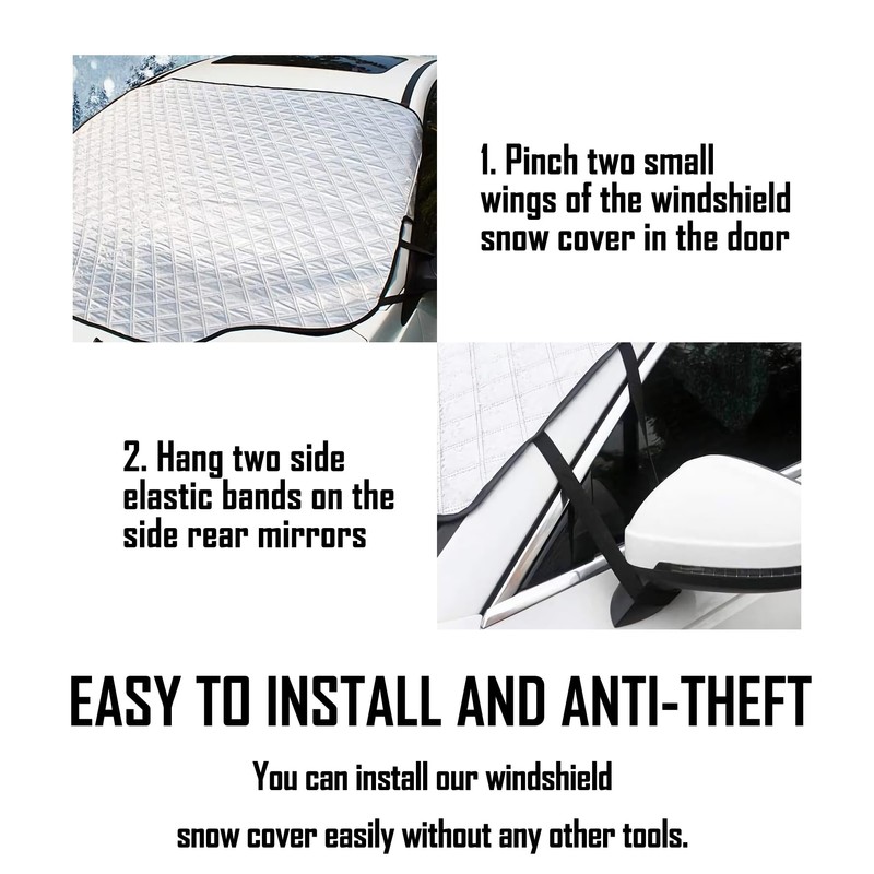 - Simple to Install: No need other tools to install the the front windshield sun shade. The snow cover for car windshield has two pockets that you can clip to the door. Hang the elastic bands to the side rear mirrors and two stretchable hooks hook the front hub. Three magnets on the front keep car cover won't fall off with heavy wind.