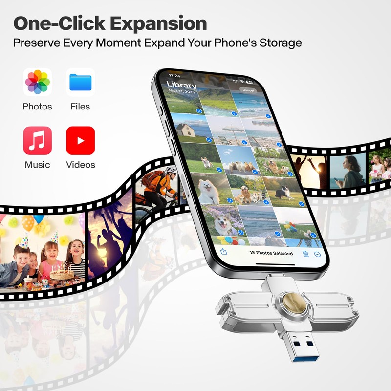 - 【Instant Access, No Internet Required】Skip unstable Wi-Fi. Our phone flash drive lets you enjoy movies, music, and photos offline anytime. Ideal for flying, remote areas or saving mobile data,. Just plug this phone memory stick into your device—no setup or passwords needed.