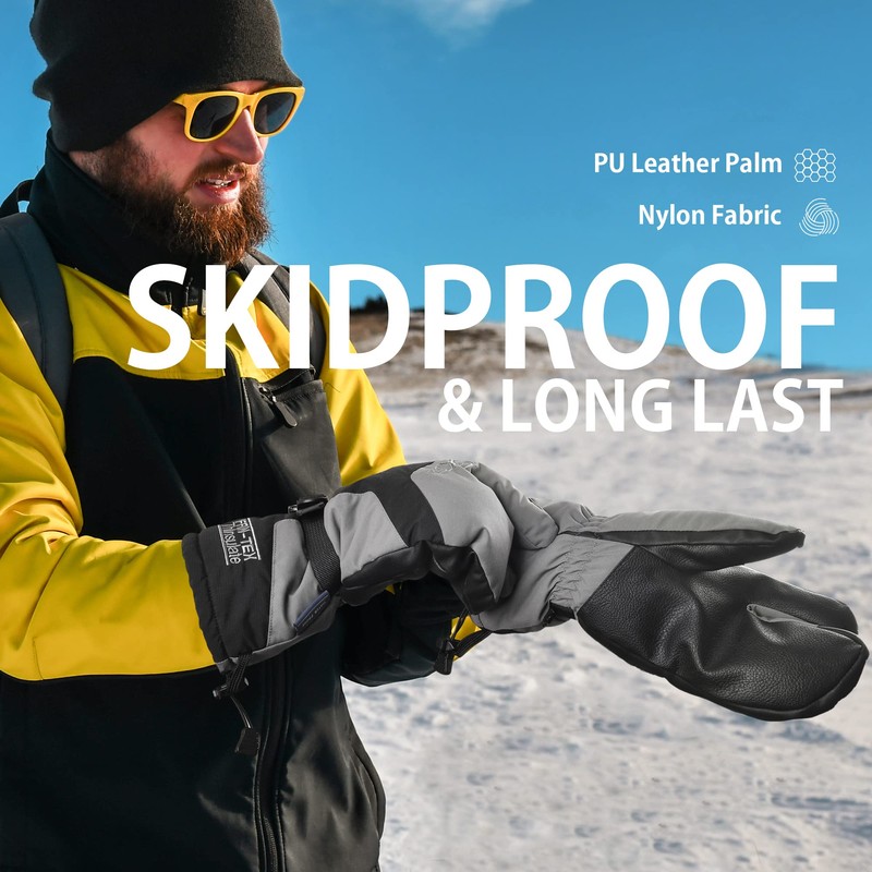 - 【Flexible 3 Fingers Design】: the warm winter mitten is a real mitten design; two separate fingers provide more flexibility for gripping skiing devices, such as ski pole, snowboard and your smart phones. Especially suitable for snowboarding, snowmobiling, motorcycling, shoveling snow and etc.