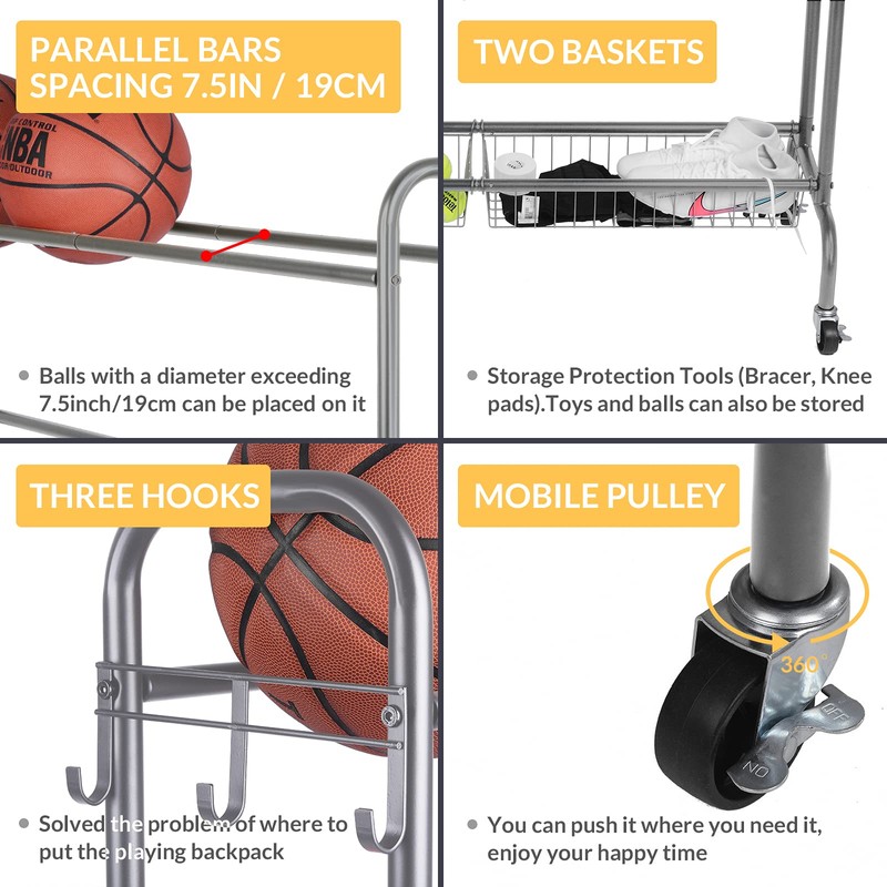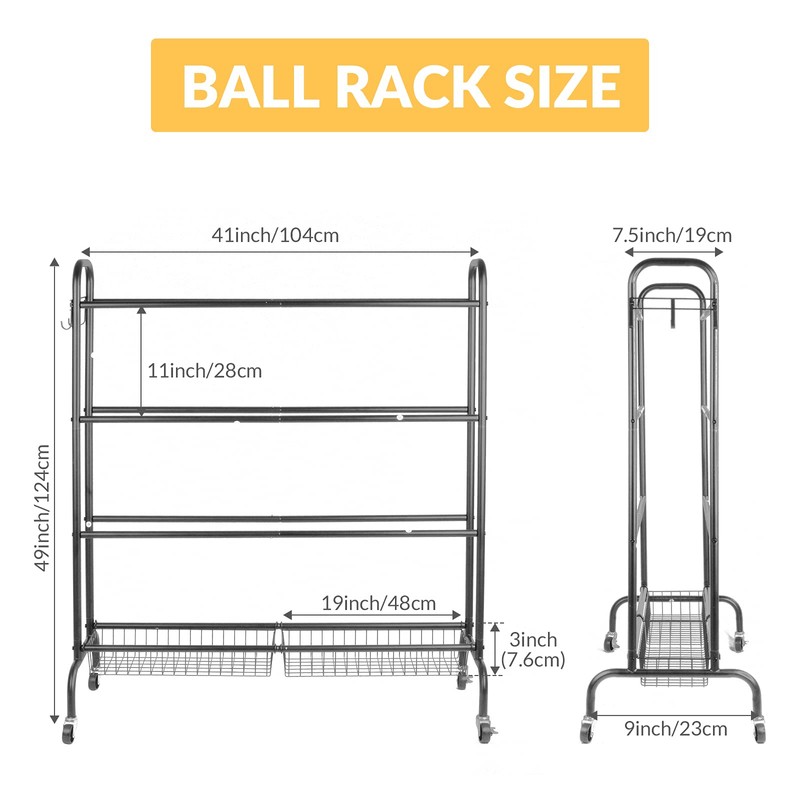 - US APPEARANCE PATENT PENDING DESIGN! 🏀【 Large Capacity Rolling Ball Rack】: Four-layer design, just to store more balls.Three-layer bracket storage, each-layer can store 4 standard balls the bracket interval is 7.5inch, suitable for storing all balls that diameter is greater than 7.5inch, suit for Size #5, #6 , #7 Balls. Note: Size #3, #4 balls can storage on two basket.