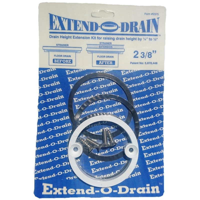Give your tile floor a finished look by raising low drain screens with the Extend-o-Drain drain Extension Kit. Each Extend-O-Drain Kit includes a 1/4" thick plastic drain height extension piece, three rubber washers and screws. Additional kits can be used for drain screens that need to be raised more than 1/4". Kit has holes to allow use with drain screens having holes 2-3/8" on center. The correct Kit Size corresponds to the distance between screw placements of the existing drain. To find the correct kit for you, measure the diameter of the drain from one screw hole to the other. Other sizes available.