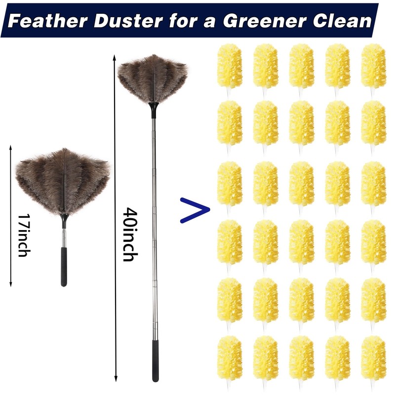 - Household High-efficiency Cleaning Duster: Our long extendable duster features 100% natural high-quality ostrichfeathers.Ostrich feathers has natural flexibility and adsorption, which can easily remove various stains, including dust, oil stains, water stains, and soil,is an ideal choice for cleaning glass vases and electronic screens