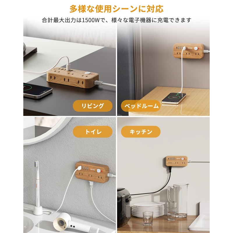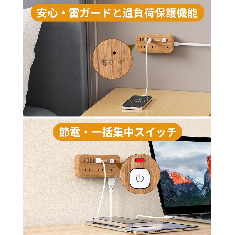 Extension Cord, 6.6 ft (2 m), Power Strip with USB, Outlet Tap, Table Tap, Switch Included, Lightning Guard, Wood Grain