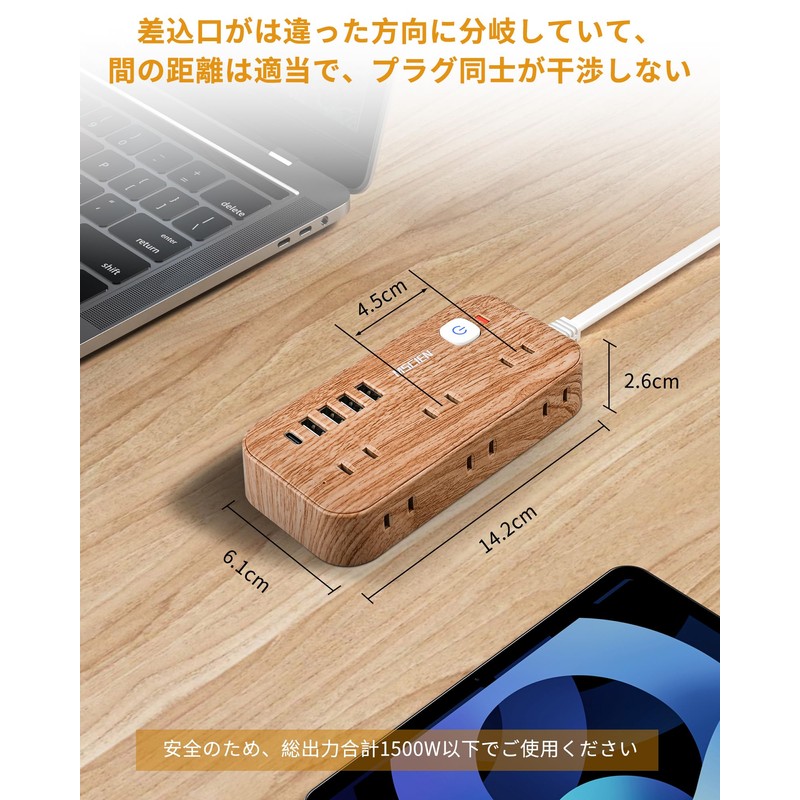 Extension Cord, 6.6 ft (2 m), Power Strip with USB, Outlet Tap, Table Tap, Switch Included, Lightning Guard, Wood Grain