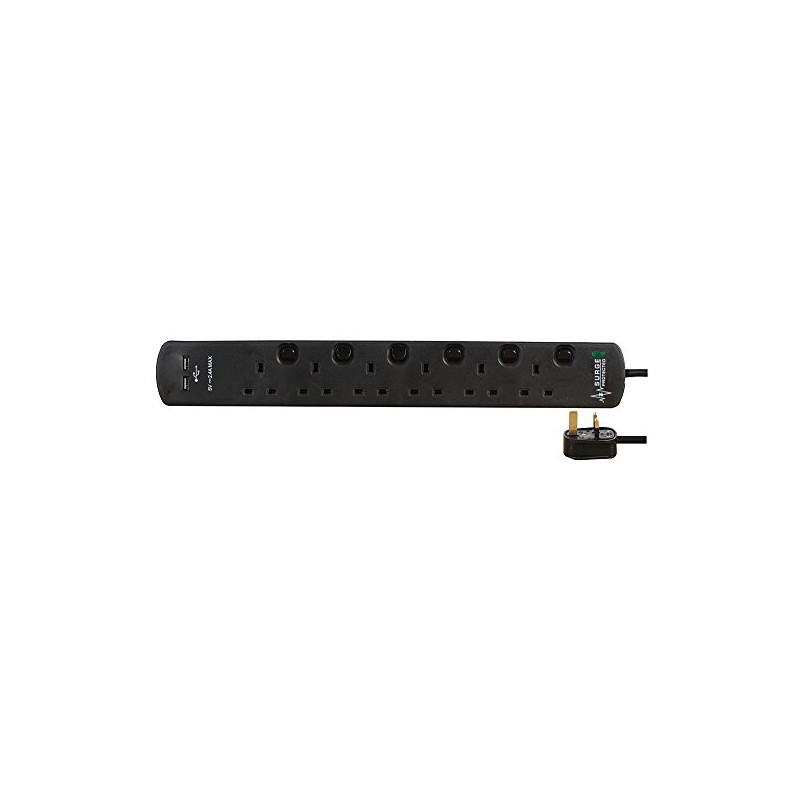 Extension Lead 6G Surge with USB BLK 2M, Electrical Power Outlet Strips - with Surge Protection Qty X 1